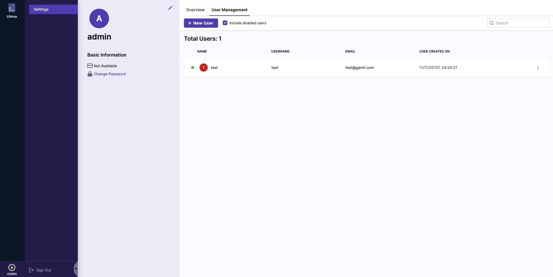 This feature enables the admin user to create a new user by assigning a unique username and password for that user. In addition to this, the admin user can also provide the name and email address of the new user, which is optional.